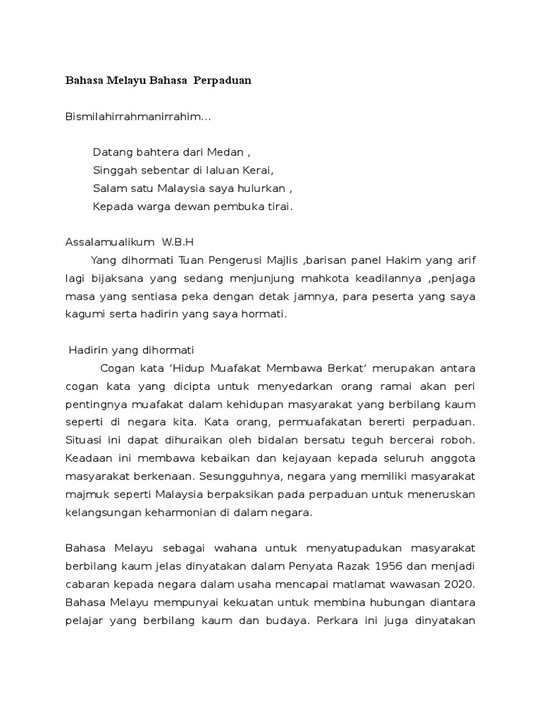 Teks Pidato Bahasa Melayu Tonggak Perpaduan Bangsa Malaysia Pdf